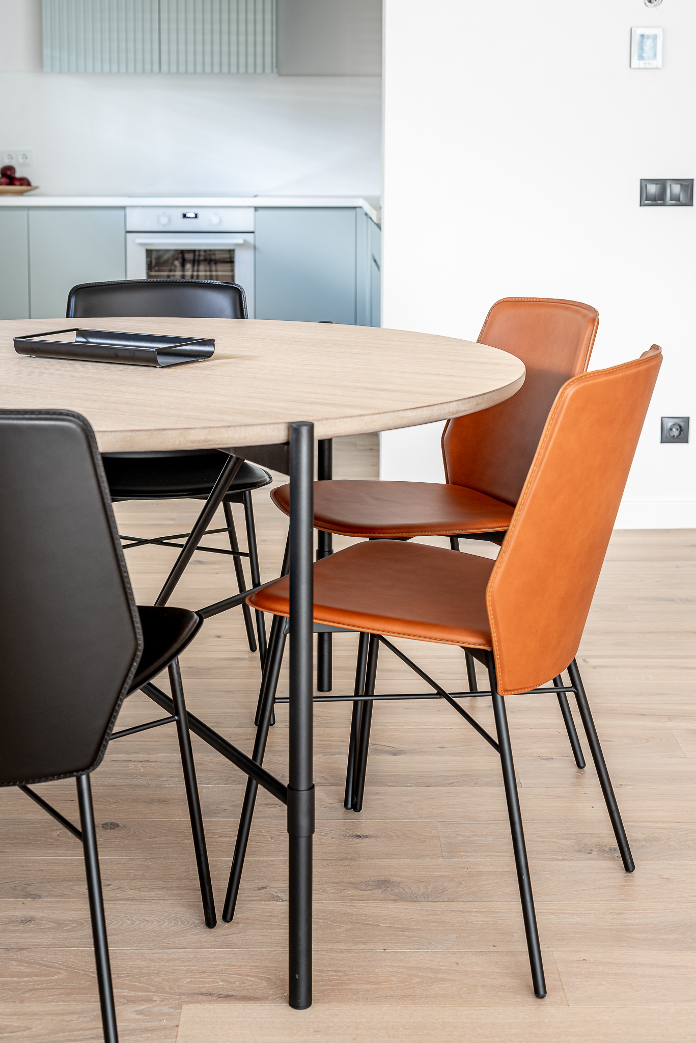 Söögitoa moodustab õhulisel raamil ümmargune laud, mis köidab pilku modernse disainiga: kolm peenikesest metallist musta jalga toetavad heledast tammepuidust lauaplaati. Pilkupüüdvad on ka laual ümber olevad elegantsed mustad ja pruunid toolid. Söögilaua kohal rippuvad valgustid mõjuvad oma pastelse tooniga aga värskendavalt.